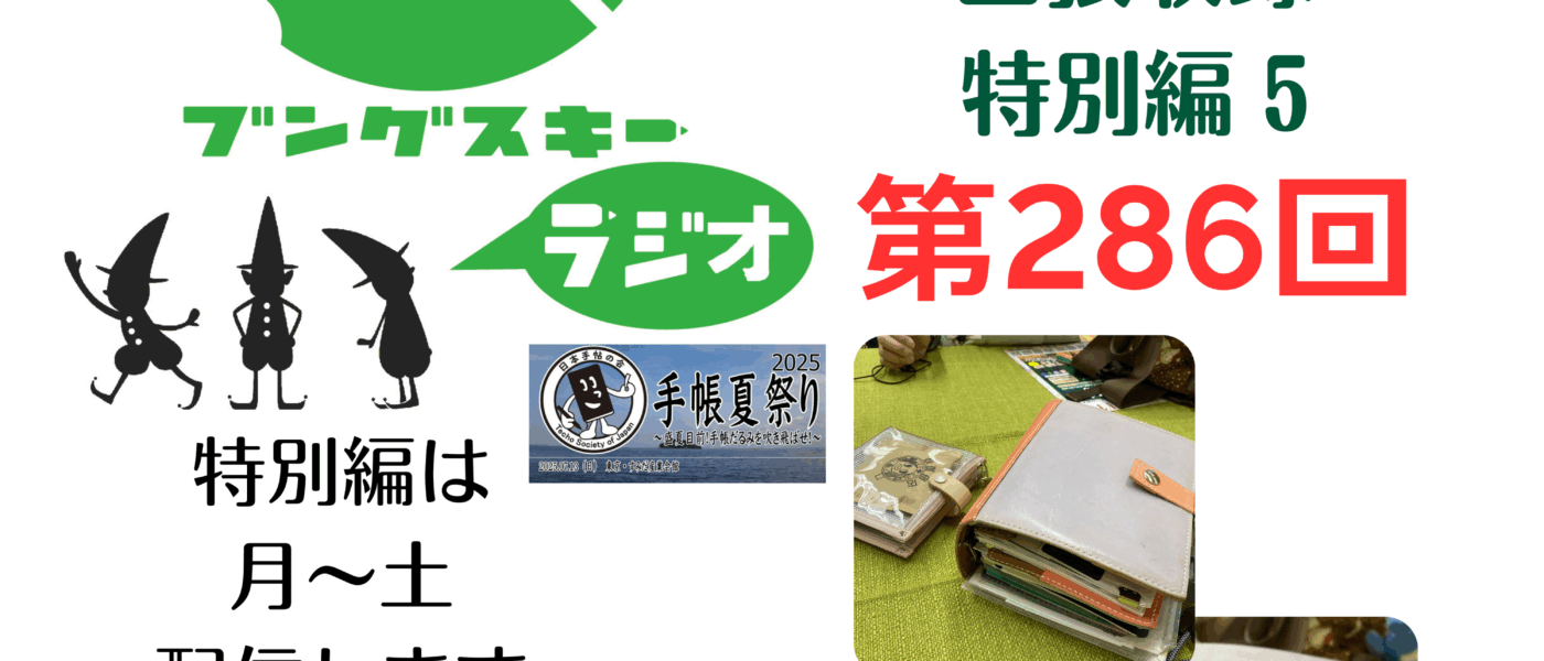 <blockquote class="wp-embedded-content" data-secret="xHCJLDcHA5"><a href="https://bungusukiradio.bunguconcierge.net/radio286/"> 第286回「特別編 手帳夏祭り出張収録5」 </a></blockquote><iframe sandbox="allow-scripts" security="restricted" src="https://bungusukiradio.bunguconcierge.net/radio286/embed/#?secret=xHCJLDcHA5" width="600" height="400" title="“ 第286回「特別編 手帳夏祭り出張収録5」 ” — ブングスキーラジオ" data-secret="xHCJLDcHA5" frameborder="0" marginwidth="0" marginheight="0" scrolling="no" class="wp-embedded-content"></iframe><script type="text/javascript"> /* <![CDATA[ */ /*! This file is auto-generated */ !function(d,l){"use strict";l.querySelector&&d.addEventListener&&"undefined"!=typeof URL&&(d.wp=d.wp||{},d.wp.receiveEmbedMessage||(d.wp.receiveEmbedMessage=function(e){var t=e.data;if((t||t.secret||t.message||t.value)&&!/[^a-zA-Z0-9]/.test(t.secret)){for(var s,r,n,a=l.querySelectorAll('iframe[data-secret="'+t.secret+'"]'),o=l.querySelectorAll('blockquote[data-secret="'+t.secret+'"]'),c=new RegExp("^https?:$","i"),i=0;i<o.length;i++)o[i].style.display="none";for(i=0;i<a.length;i++)s=a[i],e.source===s.contentWindow&&(s.removeAttribute("style"),"height"===t.message?(1e3<(r=parseInt(t.value,10))?r=1e3:~~r<200&&(r=200),s.height=r):"link"===t.message&&(r=new URL(s.getAttribute("src")),n=new URL(t.value),c.test(n.protocol))&&n.host===r.host&&l.activeElement===s&&(d.top.location.href=t.value))}},d.addEventListener("message",d.wp.receiveEmbedMessage,!1),l.addEventListener("DOMContentLoaded",function(){for(var e,t,s=l.querySelectorAll("iframe.wp-embedded-content"),r=0;r<s.length;r++)(t=(e=s[r]).getAttribute("data-secret"))||(t=Math.random().toString(36).substring(2,12),e.src+="#?secret="+t,e.setAttribute("data-secret",t)),e.contentWindow.postMessage({message:"ready",secret:t},"*")},!1)))}(window,document); //# sourceURL=https://bungusukiradio.bunguconcierge.net/wp-includes/js/wp-embed.min.js /* ]]> */ </script>